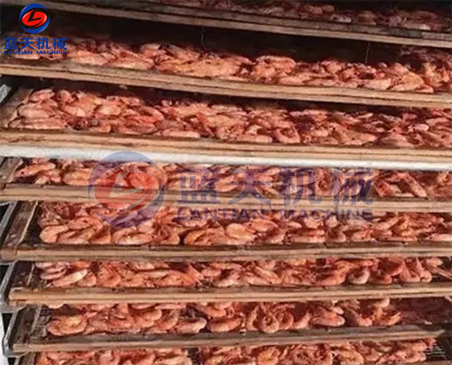 1、蒸煮后的蝦可帶殼烘干,也可剝殼對蝦仁進行烘干。將煮好的海蝦瀝干水分后,均勻地攤在烘盤上,裝進物料車,然后送入海蝦烘干房。