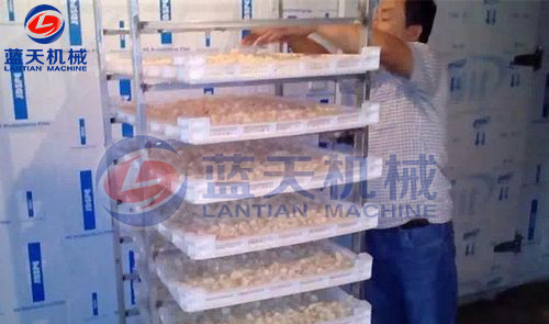 長時間用工切蒜片會受到辛辣味刺激,所以采用機械進行切片處理,蒜面平滑,厚度均勻。切片過程中蒜片的厚薄度非常重要。如切片過厚,當厚度為3mm,干蒜片的硫代亞磺酸酯保留率為70%,但蒜片干燥脫水相對要慢。如厚度越厚,不僅烘干效率慢,蒜片色澤會變差,影響品質(zhì)。如切片過薄,為1mm厚時,烘出的蒜片片形不好且碎片率較高,其中硫代亞磺酸酯保留率不到17%。當蒜片厚度以1.5-2.5mm時,烘干的色澤、外形佳,而蒜素保留率較高為50-65%,蒜片烘干機干燥蒜片的效率、品質(zhì)和蒜素含量三者達到最佳點。