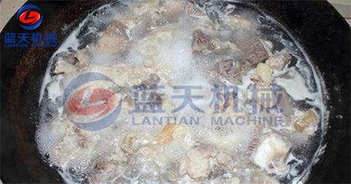 鍋內(nèi)按每千克豬肉加水1.2千克加入適量的水,加入香袋和硝酸鈉及安息香酸鈉,與肉共煮沸30-40分鐘,待肉塊出完血沫為止。