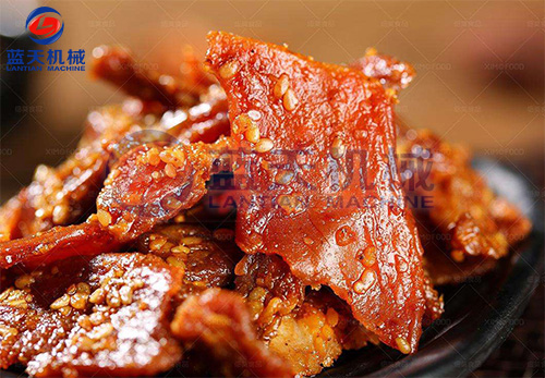 將出鍋的肉塊,置于不銹鋼網(wǎng)盤中或吊掛于烘烤推車上,然后推進烘房內(nèi)烘烤,溫度為45-60℃,烘烤時間為3-4小時,即為豬肉干。