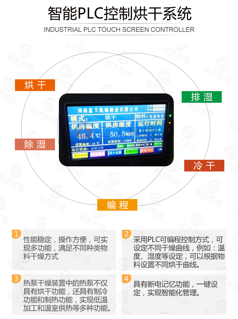1.熱泵主機(jī)產(chǎn)生的熱量經(jīng)過轉(zhuǎn)換器轉(zhuǎn)換成溫度適宜的純凈熱風(fēng)由風(fēng)機(jī)輸送到烘干機(jī)內(nèi)部;