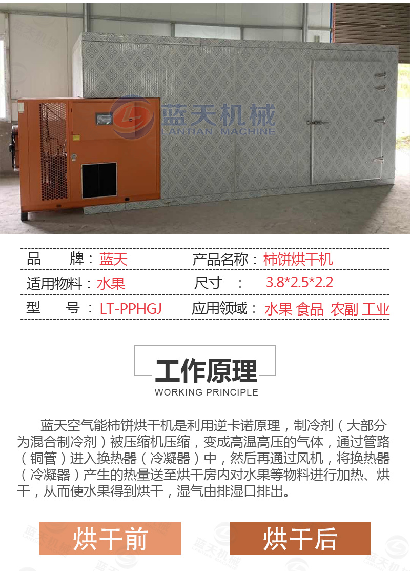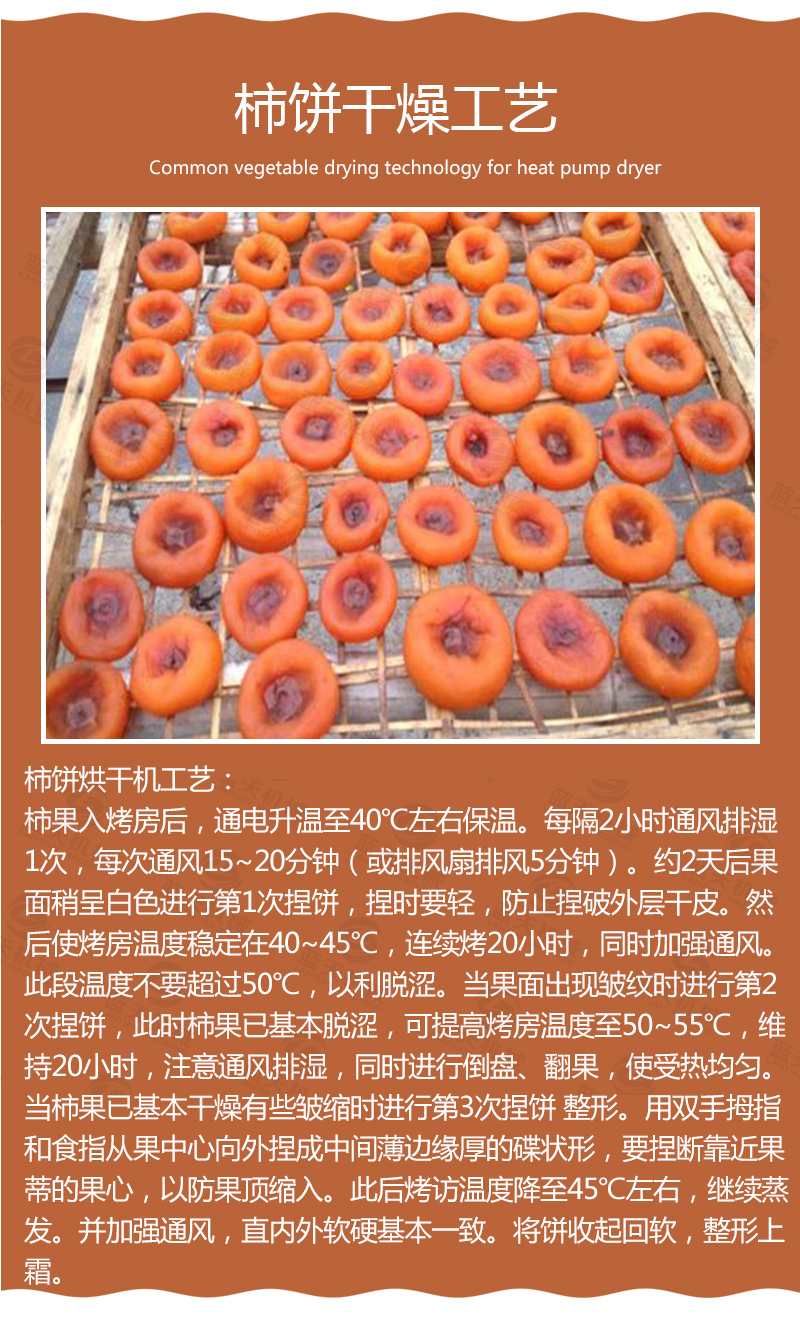 目前,國內(nèi)柿餅烘干加工工藝主要采取自然干制的傳統(tǒng)民間加工工藝。其主要流程為選果、去皮、日曬壓捏、脫色、捏曬整形、定型出霜然后包裝。由于自然干制的方法生產(chǎn)周期長,同時因長達數(shù)月的自然晾曬,微生物污染嚴重,因此產(chǎn)品的衛(wèi)生質(zhì)量差,自然干制還有占地多、用人多、用時長等缺點,我們對柿餅用熱泵烘干的進行研究,有了柿餅烘干機的產(chǎn)生,并取得突破性的成果。