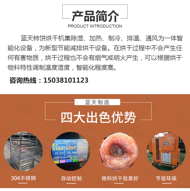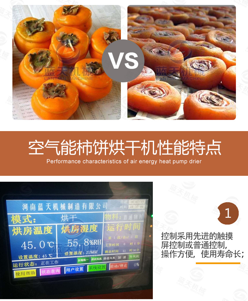 傳統(tǒng)的柿餅的生產(chǎn)周期傳統(tǒng)的自然晾曬所需要的一月有余,而采用熱泵柿餅烘干機則縮短到4-5天(根據(jù)使用時的溫濕度確定),并且在質(zhì)量上優(yōu)于自然涼曬的柿餅。在脫澀期溫度不能超過45度,濕度保持32%上下;前期烘烤期排濕不能太大,以免結(jié)皮太早以及影響回軟過程;第一次捏餅,第二次捏餅,手要輕,力要勻!大量脫水期溫度不能超過65度,濕度不能高于45度。統(tǒng)而言之為“兩烘兩停三捏”的全自動控制烘干方法。