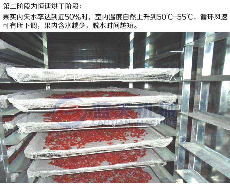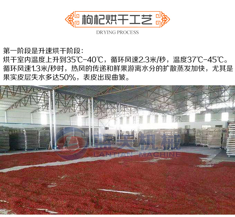 用枸杞烘干機(jī)烘干枸杞可分為三個(gè)階段:升溫階段,恒速烘干排潮階段,降速定型階段。