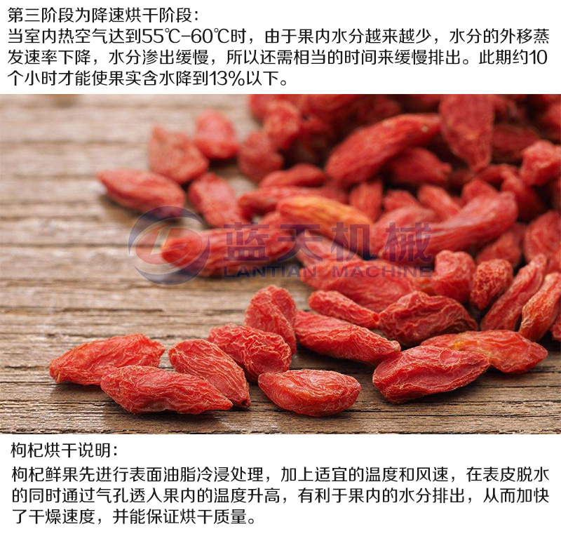 高濕低溫段,溫度小于50度,范圍40度~50度,避免高溫高濕造成枸杞顏色的變化,觀察枸杞表面水汽變化,隨時(shí)排潮,這段時(shí)間應(yīng)在3~3.5小時(shí)。