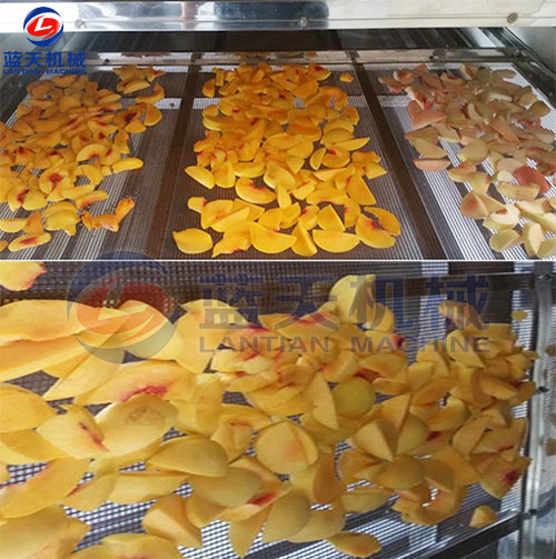 2、均勻切成小塊,放在黃桃烘干機(jī)的托盤上,配置的托盤材料是食品級別的,不會對黃桃造成污染。